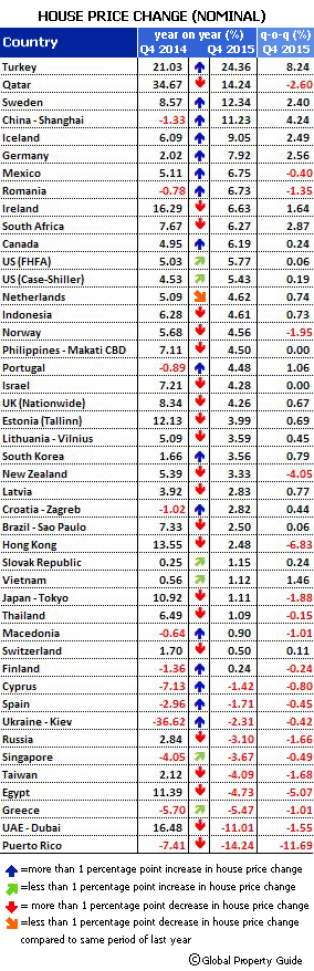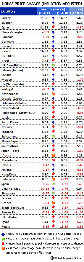 Turkey was the strongest performer in our global survey, with house prices surging by 14.32% during 2015, up from an increase of 11.88% last year. House prices increased 5.66% q-o-q in Q4 2015. Turkey's housing market was boosted by robust economic growth, despite a collapsing currency, dissatisfaction with the government, chaos on Turkey's doorstep in Syria and Kurdish Iraq, and rising internal tensions.